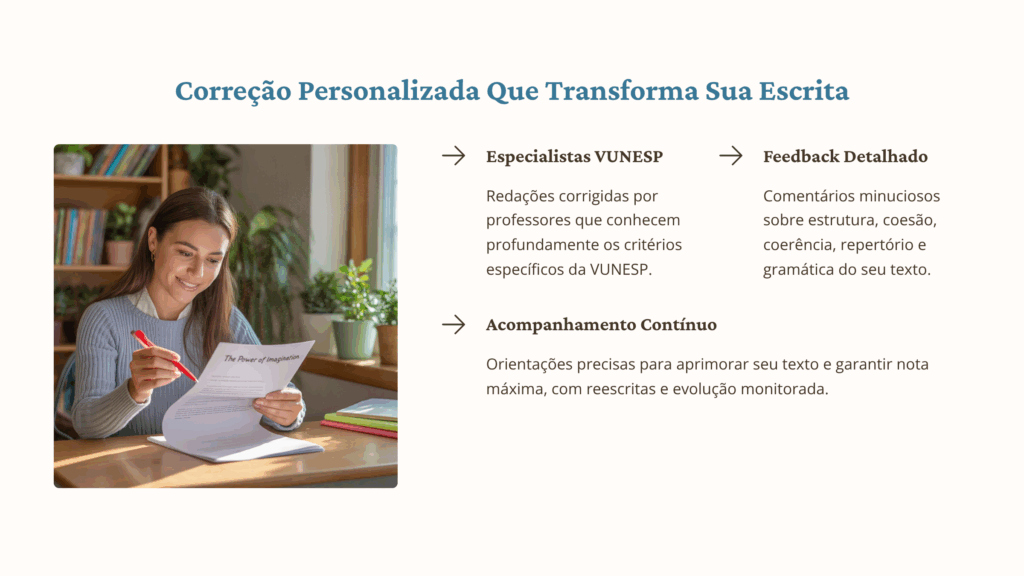 oferecemos correções semanais personalizadas, feitas por videoconferência com o aluno, acompanhadas feedbacks detalhados para aprimorar seu desempenho e escrita.